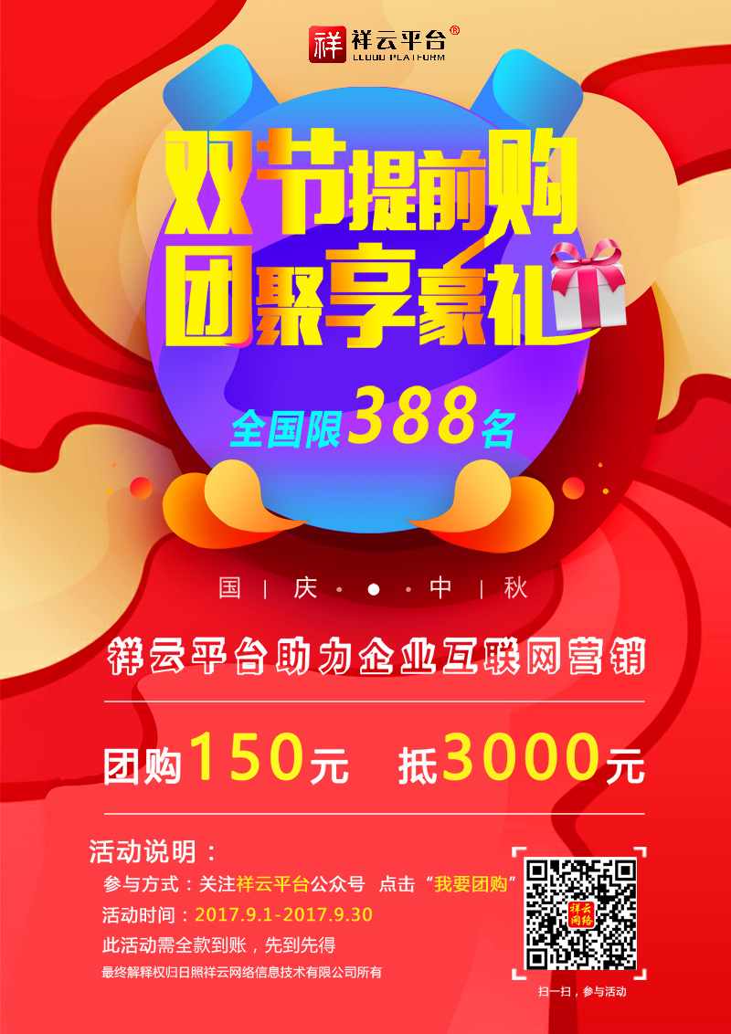 迎中秋,慶國慶,值此雙節(jié)來臨之際,祥云網(wǎng)絡(luò)助理企業(yè)互聯(lián)網(wǎng)營銷,團購150元抵3000元;顒舆M行中……