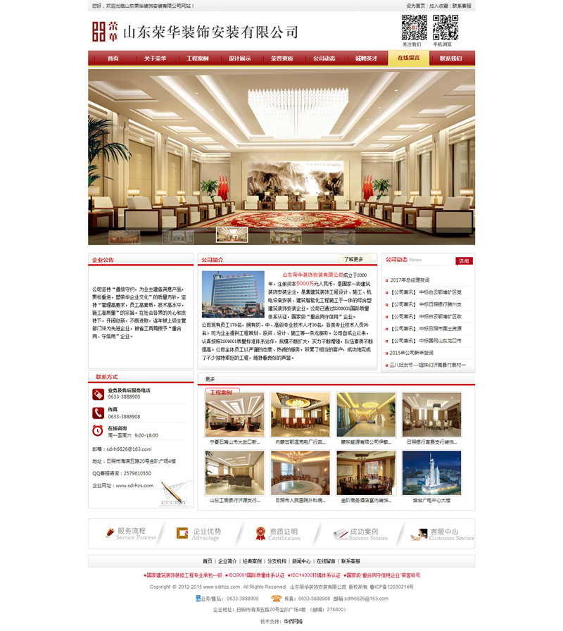 公司自成立以來(lái),認(rèn)真按照ISO9001質(zhì)量標(biāo)準(zhǔn)體系運(yùn)作,規(guī)模不斷擴(kuò)大,實(shí)力不斷增強(qiáng),隊(duì)伍素質(zhì)不斷提高。公司全體員工以嚴(yán)謹(jǐn)?shù)膽B(tài)度、熱誠(chéng)的服務(wù),積累了相當(dāng)?shù)目蛻,成功的完成了很多艱巨的建筑安裝工程,維持著良好的聲譽(yù)。公司尊重知識(shí),尊重人才,開發(fā)技術(shù)力量,依靠科技進(jìn)步,創(chuàng)造自己的企業(yè)文化,激發(fā)員工的向心力和凝聚力。建立起了完善的集設(shè)計(jì)、施工、銷售、服務(wù)等為一體的時(shí)常經(jīng)營(yíng)體系。同時(shí),不斷加強(qiáng)企業(yè)內(nèi)部管理,實(shí)現(xiàn)了公司電腦網(wǎng)絡(luò)化管理。塑造品牌,重視信譽(yù),嚴(yán)把質(zhì)量關(guān),形成了一整套完善的施工管理和質(zhì)量保證體系,使榮華形成了一支凝聚力強(qiáng),能夠立足山東,面向全國(guó),高瞻遠(yuǎn)矚,積極向上的集體。“做精品工程,創(chuàng)榮華品牌”的經(jīng)營(yíng)理念使榮華的事業(yè)蒸蒸日上.我公司先后在省內(nèi)外承接了金階商務(wù)酒店室內(nèi)裝修工程、山東淄博市工商銀行沂源、南定、洪溝、臨淄、桓臺(tái)、胡田、王舍、唐索路等分理處室內(nèi)外裝飾工程、寧夏石嘴山市大武口新區(qū)行政及文化中心裝飾工程、蒙東能源有限公司伊敏河?xùn)|礦區(qū)第一煤礦辦公樓及宿舍樓裝飾工程、內(nèi)蒙古鄂溫克發(fā)電廠行政辦公區(qū)及輔助生活區(qū)裝飾工程、日照市人民醫(yī)院外科病房樓及生活服務(wù)中心室內(nèi)裝飾工程、山東省日照銀行莒縣支行辦公樓裝飾工程、安徽省合肥市安徽移動(dòng)大廈辦公樓室內(nèi)裝飾工程、山東日照市工商銀行市中分理處、山東省博物館新館(通風(fēng)空調(diào)安裝工程)、河南省人民醫(yī)院(通風(fēng)空調(diào)安裝工程)、山東大廈賓館樓(空調(diào)系統(tǒng)及主供電系統(tǒng)安裝工程)、西安海關(guān)緝私辦公大樓(裝飾、空調(diào)工程)、西安中建西北設(shè)計(jì)院(安裝及部分裝飾工程)、日照市人民醫(yī)院特需病房樓(智能化安裝工程)、日照市會(huì)展中心(音響視頻會(huì)議系統(tǒng)設(shè)計(jì)及安裝調(diào)試工程)、日照永發(fā)房地產(chǎn)風(fēng)景水岸花園G5#G6#(外墻保溫屋面保溫工程)等大、中型室內(nèi)外裝飾安裝工程共40余項(xiàng),完成的工程涵蓋黨政、金融、企業(yè)、酒店、醫(yī)院、房地產(chǎn)類等眾多領(lǐng)域。工程一次驗(yàn)收合格率達(dá)100%,優(yōu)良率達(dá)96%。